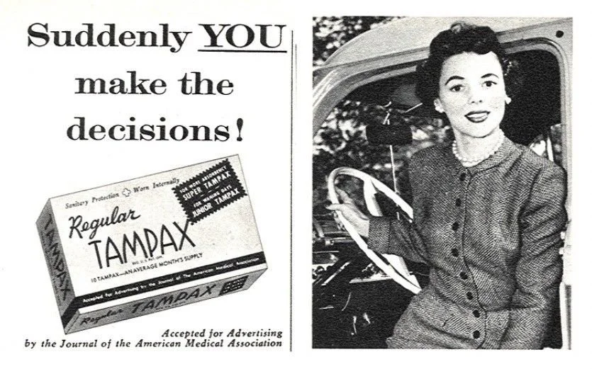 Dr. Haas sold his invention to Gertrude Tendrich, who was definitely not a quant, and definitely was a brilliant marketer. She sold “freedom,” and never discussed the details of the device itself in her ads. The ads did say “no pins, no belts, no pads.” But the closest they came to describing the device was to say, rather obscurely, that they were “worn internally.”